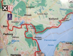 Der Wiesenweg geht in einen Wald und wir treffen wieder auf meinen vorbereiteten Track. Nun geht es durch Wald und am Waldrand bist Staudt. Auch hier gibt es marginale Änderungen der Wegführung zu meinem vorbereiteten Track. In Staudt hat eine Kindergartengruppe ein Projekt zum Thema E1 gemacht. Steht auf einem Schild. Toll, finden wir! Das Ergebnis (eine Holzplatte mit unterschiedlich gestalteten Landschaften) würden wir gern mal live sehen. Auf dem folgenden Fußweg sehen wir je eine Plakette die Schweden und Dänemark darstellen. Deutschland, Schweiz und Italien finden wir nicht.