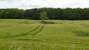 Es geht erstmal in eine Unterführung unter der Landstraße durch. Wir überlegen die wievielte Unterführung es wohl ist auf dem E1 bisher. Auf der anderen Straßenseite befindet sich noch der Wohnmobilstellplatz des Campingplatzes und eine Wiese die wir überqueren. Dann geht es auf einem Feldweg (natürlich geschottert) zwischen Wald und Wiese nach Süden. P bekommt plötzlich Panik, dass er sein Duschzeug im Lavendelhäuschen vergessen hat. Er lässt seinen Rucksack bei uns und rennt noch mal zurück. B und ich schlendern mit Ps Rucksack schon etwas weiter und warten auf einer Wiese bei der nächsten Abbiegung, damit er nicht vorbeiläuft. Auf der Wiese gibt es Zecken. Schon hat B eine am Bein. P kommt zurückgewetzt und hat sein Duschzeug erfolgreich wieder. Eine Zeckenkarte hat er sogar auch. B ist gerettet.